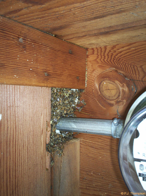 Bee and comb between walls.