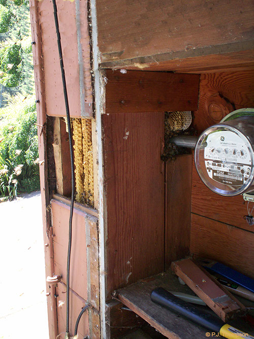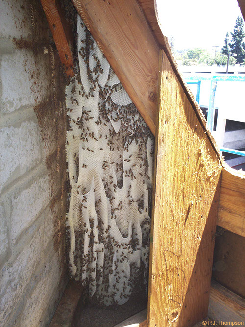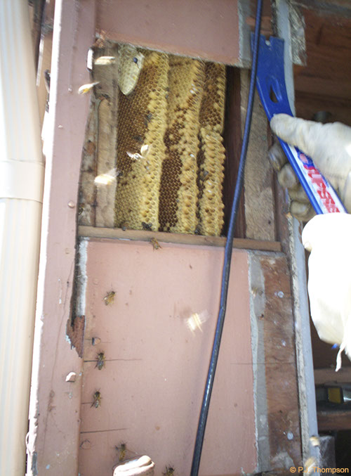 Bees and comb in exterior wall.
