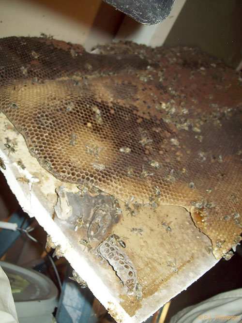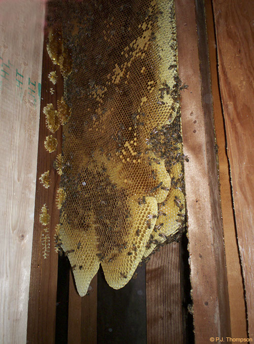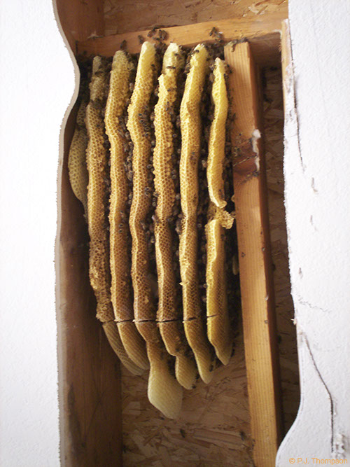 If bees in a wall are killed but the nest is not removed, the combs are no longer ventilated and wax and honey may melt and stain interior walls — the honey also attracts ants, cockroaches, mice, and rats.